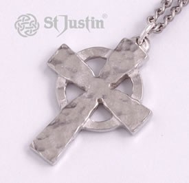 Hammered pewter Celtic cross on tin-plated or surgical steel curb chain.